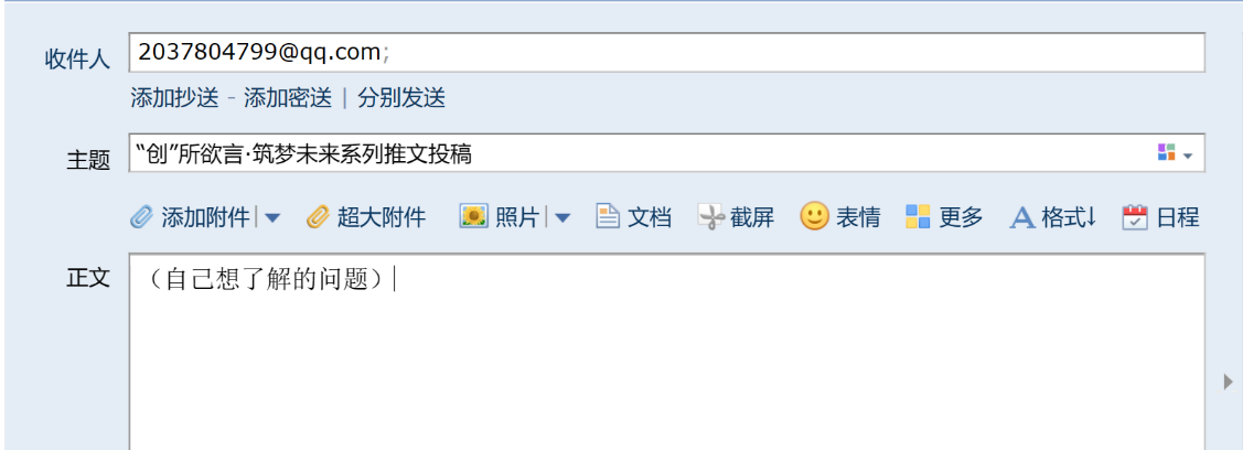 看过各位学长的分享,大家有没有什么收获呢?如果大家在科创方面有什么想了解的问题,可以将自己的问题发送到2037804799@qq.com,邮件格式如下图。我们下次见面!