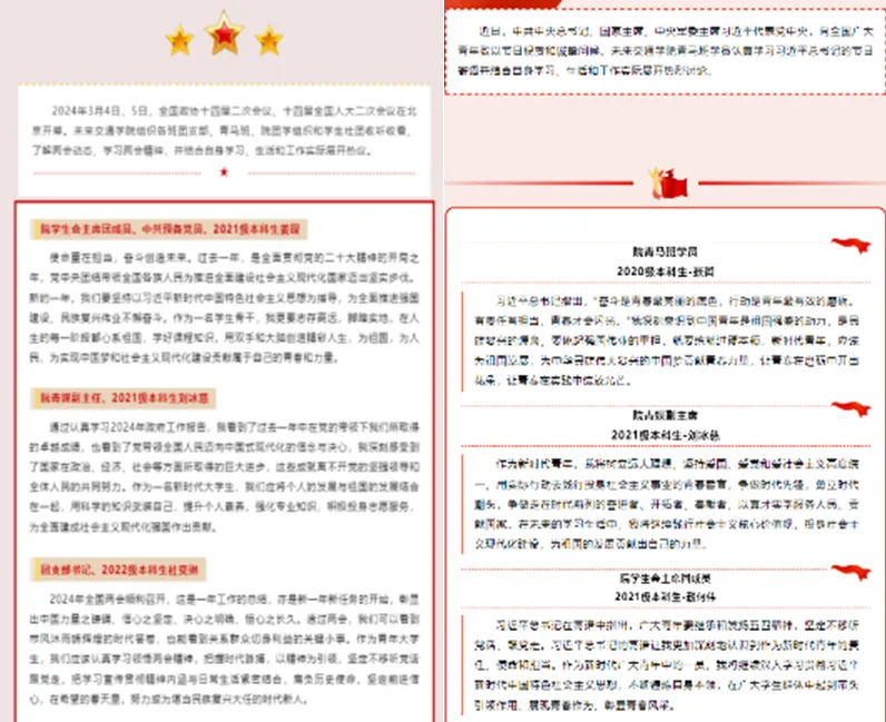 院学生会依托工科青年说、青年讲师团等活动形式为载体,以点带面广泛开展党的二十大精神,面向团员和青年开展学习贯彻习近平新时代中国特色社会主义思想主题教育学习报告会、主题研讨会。围绕重要时间节点,组织开展热议全国两会精神、五四青年节寄语等多种学习实践活动100余次,特别邀请院领导、长安星火宣讲团、专职团干部、“青马”学生骨干培训领航班学员进课堂,实现全院学生覆盖率100%。
