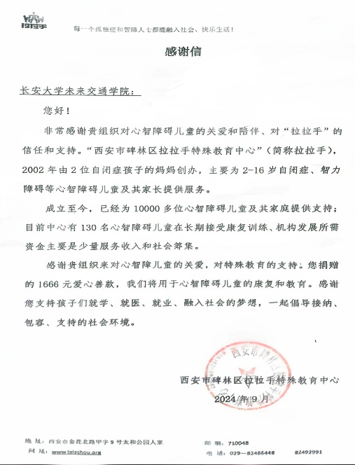 学院前期策划举办了首届“青春市集爱心漾,长安园中情意长”跳蚤市场活动,义卖所得收入现全额捐赠给特教中心。曾晓阳与负责人共同为“米兰·(milan)中国大学生志愿服务实践基地”揭牌,负责人对我院关爱和支持特殊儿童群体表达了由衷的感谢,并向学院回赠感谢信。