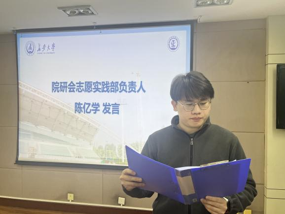 院研会志愿实践部负责人陈亿学从“桥梁搭建、温度传递、成长赋能”三个维度阐述工作理念,倡议全体成员以学术研究的严谨态度创新服务形式,构建“学术-实践”协同发展生态。