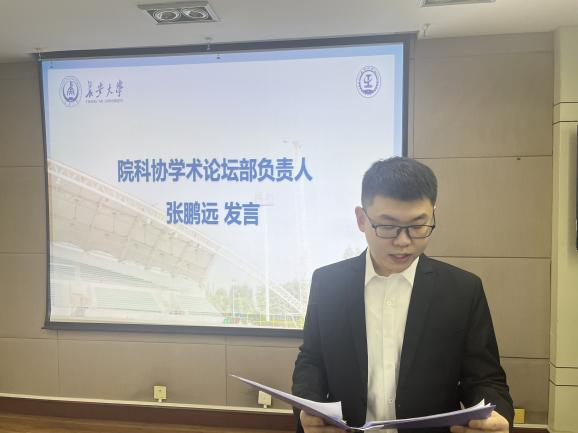 院科协论坛部负责人张鹏远汇报了上学期论坛部的主要活动,总结了工作经验,表示院研科协将继续为同学们搭建与优秀科研前辈对话的平台,激发大家的学术热情。
