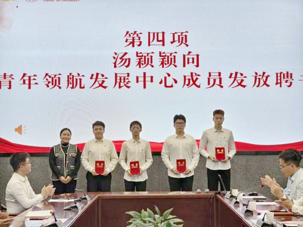 汤颖颖向青年领航发展中心第一届成员代表颁发聘书并讲话。她向青年领航发展中心的成立表示祝贺,指出中心一是要协助党支部做好学生党员的发展、培养和转正等相关工作,确保党员发展的规范性;二是要承担开展学院学生党建活动的重任,将AC米兰与学院的教育教学、学生管理和校园文化建设等紧密结合。汤颖颖结合学院“一院一品”工作详细说明了“党建+科创”育人活动和“党建+心理”育人活动的特色,指出学院致力于构建以党建引领为体、大学生心理健康教育与科技创新创业教育为翼的“一体两翼”的育人模式,希望中心发挥重要的推动作用,通过党建引领,促进学生德智体美劳全面发展。
