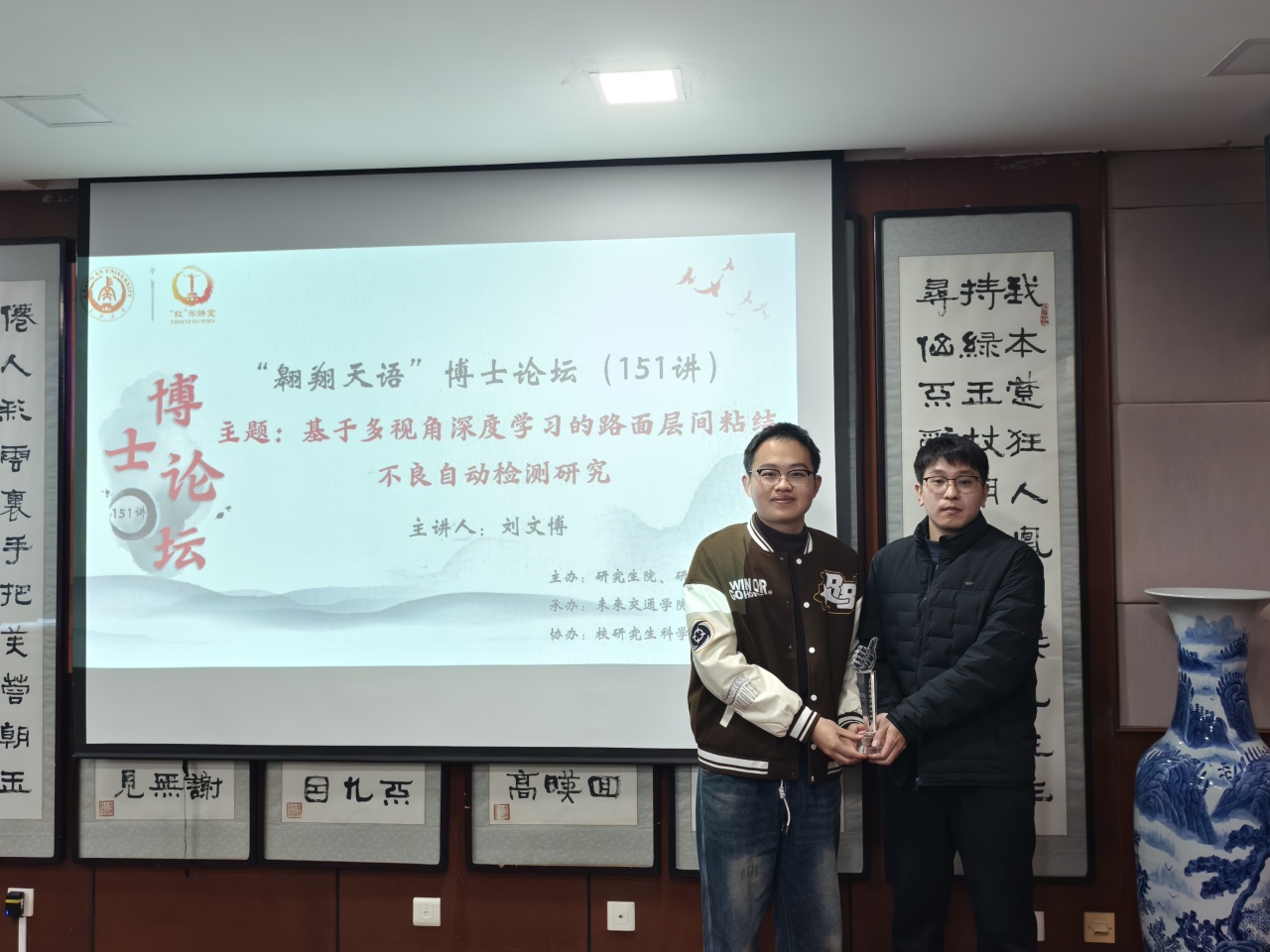 院研科协主席团成员季书贤进行总结,他指出此次“翱翔天语”博士论坛选题契合道路领域科研前沿,内容详实,视角独特,具有较强的理论价值与实践指导意义,对同学们拓展科研思维、深化学术理解具有积极作用。他鼓励同学们主动参与各类学术交流活动,持续提升科研素养,敢于突破、善于创新,在科研道路上不断取得新的进步。随后,季书贤为刘文博颁发了纪念奖杯并合影留念。