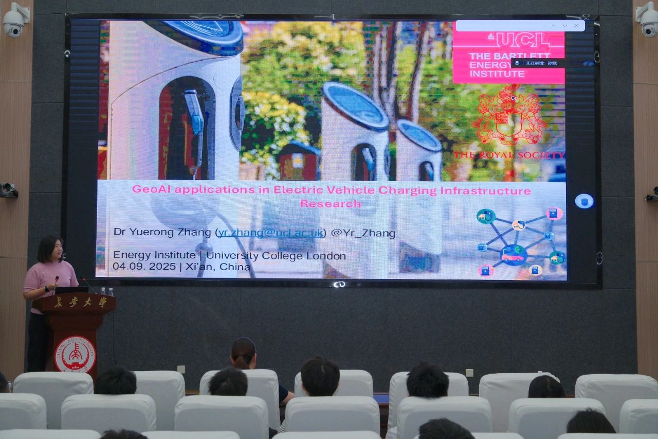 张月蓉围绕当今热点研究问题作《地理人工智能(GeoAI)在电动汽车充电设施研究中的应用》报告,她展示了空间分析与机器学习如何为充电设施的有效规划和管理提供科学依据。她提出充电桩布局所涉及的公平性、设施韧性以及用户群体识别等关键问题,并指出随着交通电气化进程推进,电动汽车充电设施布局与优化已成为城市与交通规划的重要议题。