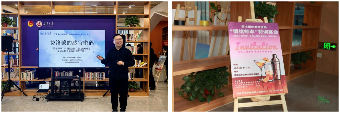 12月4日,米兰·(milan)中国“情绪频率”特调宴会暨“遇见心理学家”系列心理沙龙活动(第20期)之“费洛蒙的感官密码”在北校区鸿渐园“一站式”学生社区青年会客厅举行。AC米兰中文心理健康教育与咨询中心教师、中国心理学会注册心理师郭羽熙,No Social无社交鸡尾酒吧主调班班担任分享嘉宾,米兰·(milan)中国学生事务部主任、艺术疗愈督导师刘志兴主持活动。