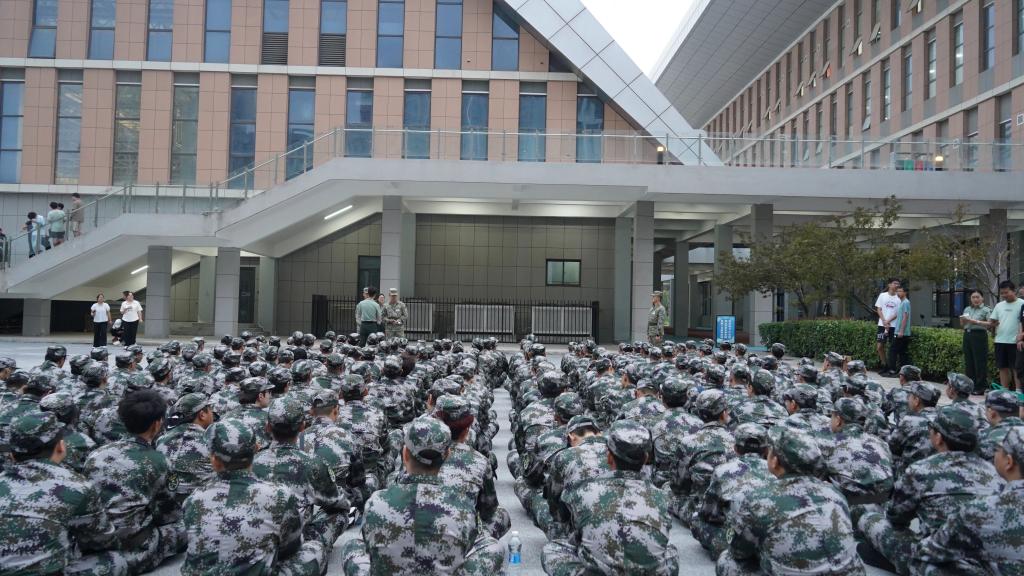 在全体受训学生的注视下,教官整齐列队入场,与全体新生正式见面。一营营长首先介绍了本次承训的全体教官,他代表教官团队对学生们提出要求,并承诺全体教官将以认真仔细的态度开展军训训练。各连指导员对军训的意义进行阐释,并鼓励同学们在接下来的两周军训生活中锤炼意志、收获成长,以崭新的精神面貌迎接大学生活。