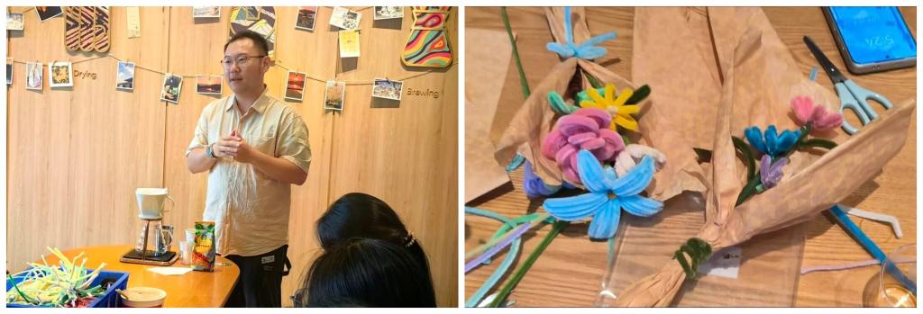 随后,店员通过现场演示,向参与同学详细讲解扭扭棒的基础技法,从单根扭扭棒的弯折、卷曲,到多根材料的缠绕、组合,再到借助剪刀、胶带等工具固定造型的技巧,向我们逐一示范玫瑰,小雏菊,水仙花的制作流程与细节技巧。同时,针对同学们的操作疑问进行耐心解答,为同学们后续的创作扫清障碍。在一片祥和的氛围中,同学们相互交流技巧,彼此帮助。教室内不时响起对创意作品的赞叹声,欢声笑语中,一件件充满个性与巧思的手作作品逐渐成型。