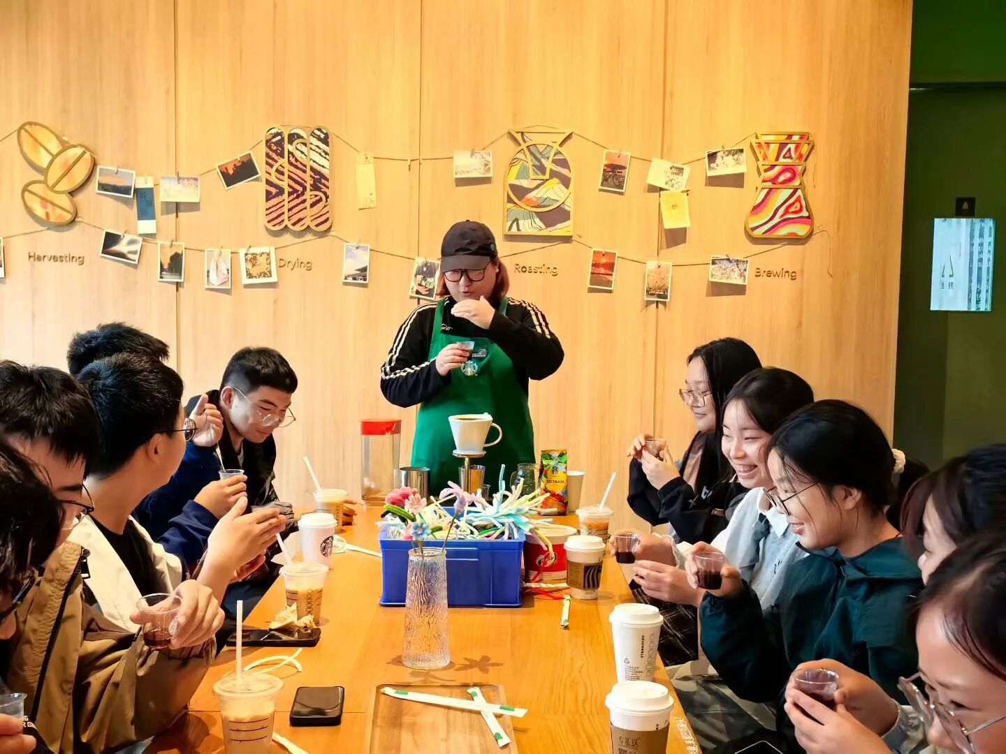 活动伊始,星巴克店员为在场师生带来专业的手冲咖啡制作展示。店员详细讲解了手冲咖啡的核心工艺——从咖啡豆的品种特殊、水温控制,到滤纸折叠方法、水流速度把控,再到分段萃取的具体流程,让同学们直观了解手冲咖啡的制作要点。随着热水缓缓注入研磨好的咖啡粉,越南咖啡豆的可可与焦糖香气在教室内逐渐弥漫,为活动奠定了温馨治愈的基调,也让同学们在动手创作前先感受到慢节奏的放松氛围。