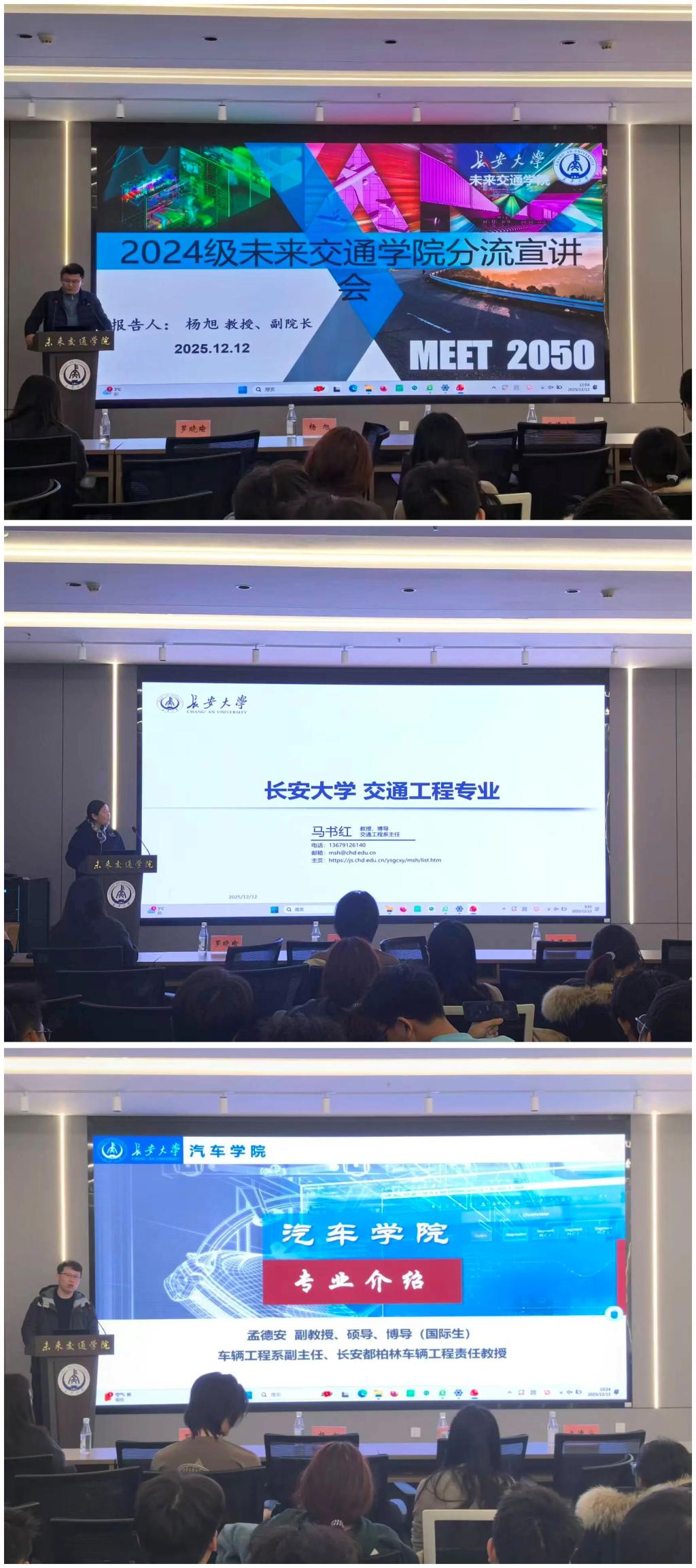 宣讲会分为三个专题环节,分别由公路学院、运输工程学院和汽车学院的专业负责人系统介绍了各专业的建设情况。三位老师围绕专业特色与发展方向、课程体系与就业前景、师资力量与科研背景、以及高水平科研平台与资源等方面,进行了全面而深入的阐述。既涵盖了传统优势方向,也突出了智能化、新能源、网联化等前沿发展趋势,为同学们呈现了清晰的专业画像和广阔的发展空间。