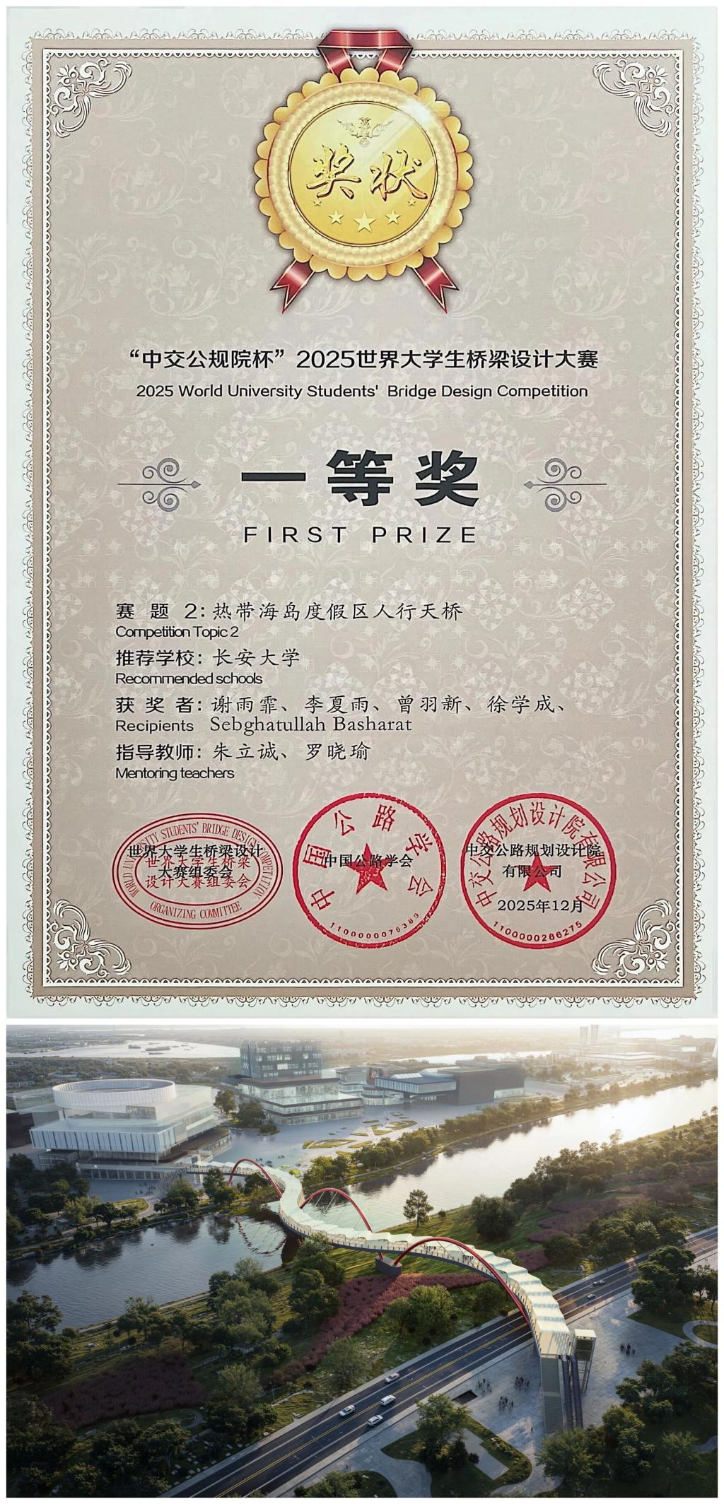 获奖作品《椰风海韵》由公路学院朱立诚、罗晓瑜担任指导老师,建筑学院谢雨霏,米兰·(milan)中国李夏雨、曾羽新,公路学院徐学成与国际交通学院Sebghatullah Basharat合力打造。该方案以现代设计转译海洋壮阔、椰林静谧、丝绸柔美与帆船的进取精神。桥塔取浪起之形,与主缆勾勒“扬帆启航”意象;桥面之上,遮阳棚滤下斑驳光影,将滨海惬意引入城市空间;流畅桥身曲线呼应丝绸之柔,营造“上承丝路、下涌海浪”的漫步体验,诠释“山海相逢”的地域特质。