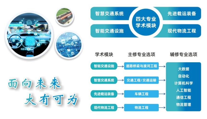 主辅修跨学科培养:交通类主修+信息类辅修,精准把握交通领域突破点,推动信息技术的深度应用与数智融合。