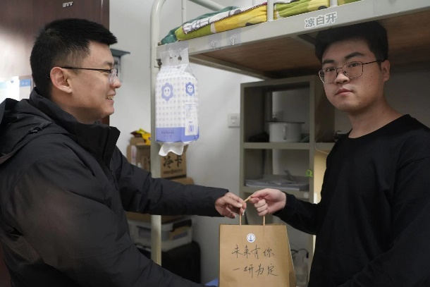 走访过程中,学院老师与考研学生展开深入交流,充分了解学生们的备考情况和日常需求,勉励考研学子既要明确目标,用持之以恒的态度坚持到底;又要在考研最后的冲刺阶段注意合理饮食、劳逸结合,以充沛的精力和良好的身体状态迎接考试。老师们贴心的关怀与问候,对于不畏严寒、备考热情不减的考研学子而言格外温暖。整个活动伴随着欢笑与浓浓师生情,为冬日校园平添了一道靓丽温暖的风景线。